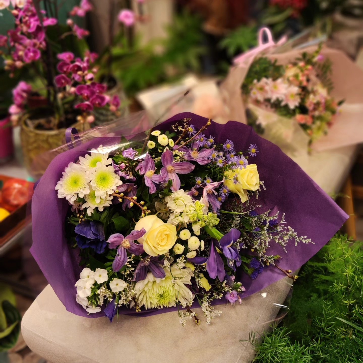 Vild buket i blå og hvid